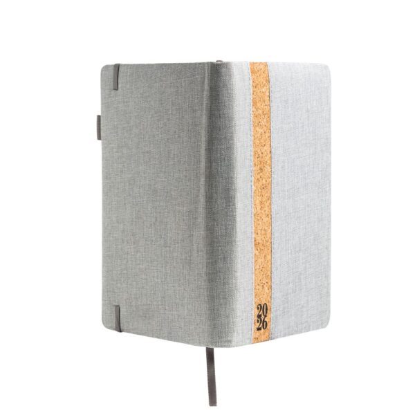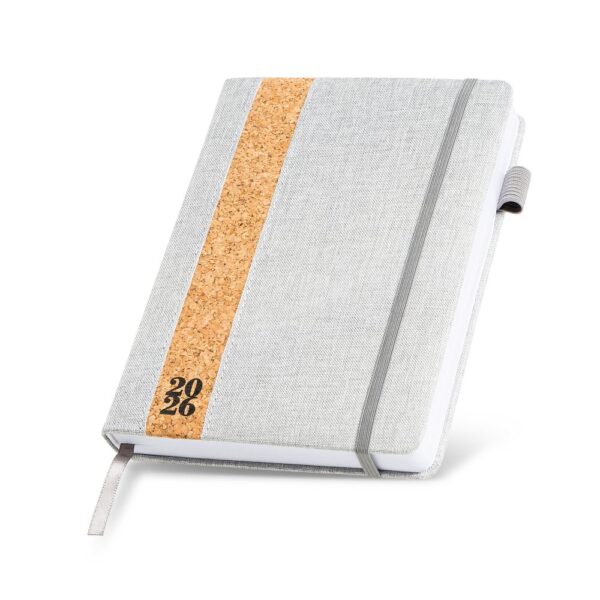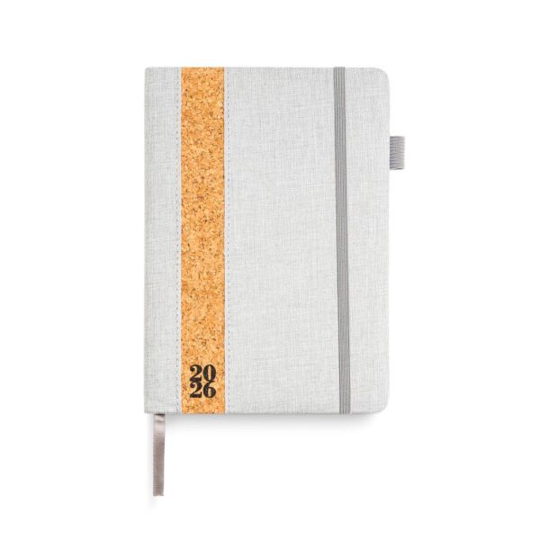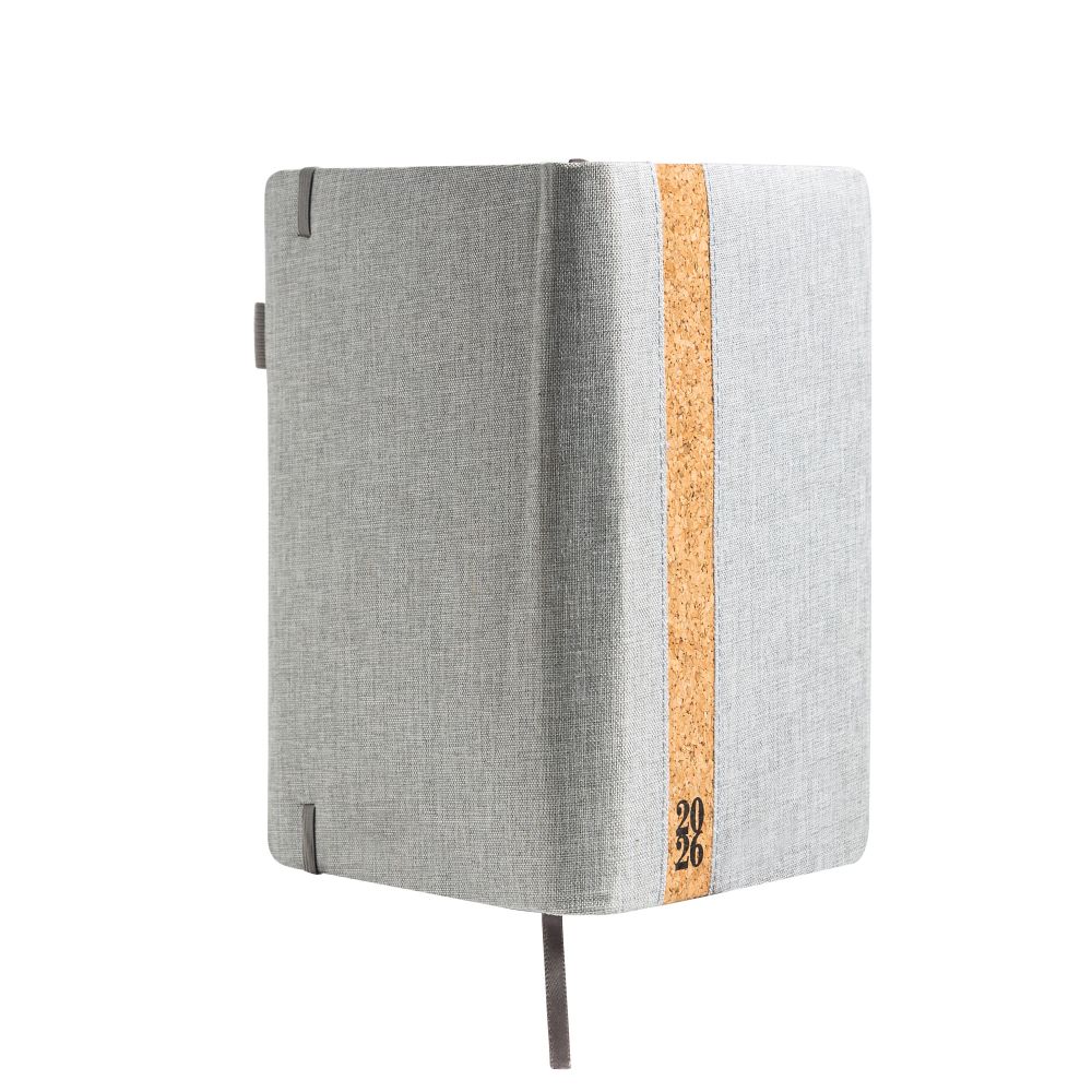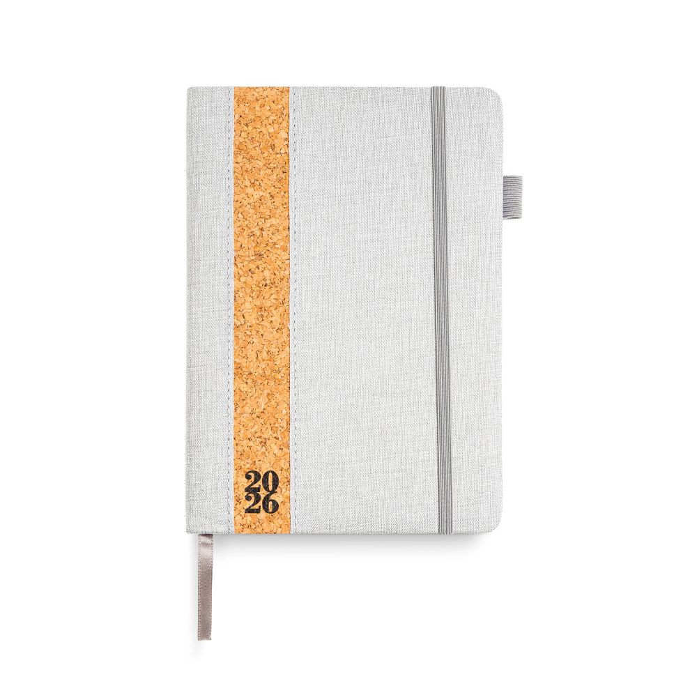 Agenda diária A5. Capa em linho e cortiça com fitilho , elástico de fecho e suporte para esferográfica. Com 336 páginas , em papel branco 70gr e certificação FSC (papel proveniente de florestas geridas de forma responsável). Idiomas principais: Português e Espanhol. No interior inclui: espaço para preenchimento de dados pessoais; calendário completo de 2026 e semestre de 2025 e 2027; feriados em lista; plano de férias; plano diário 2026 e espaço para preenchimento de contactos importantes (de A-Z).