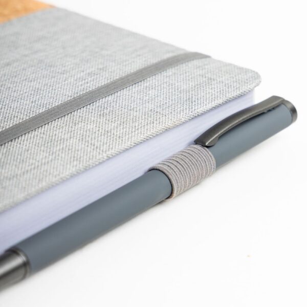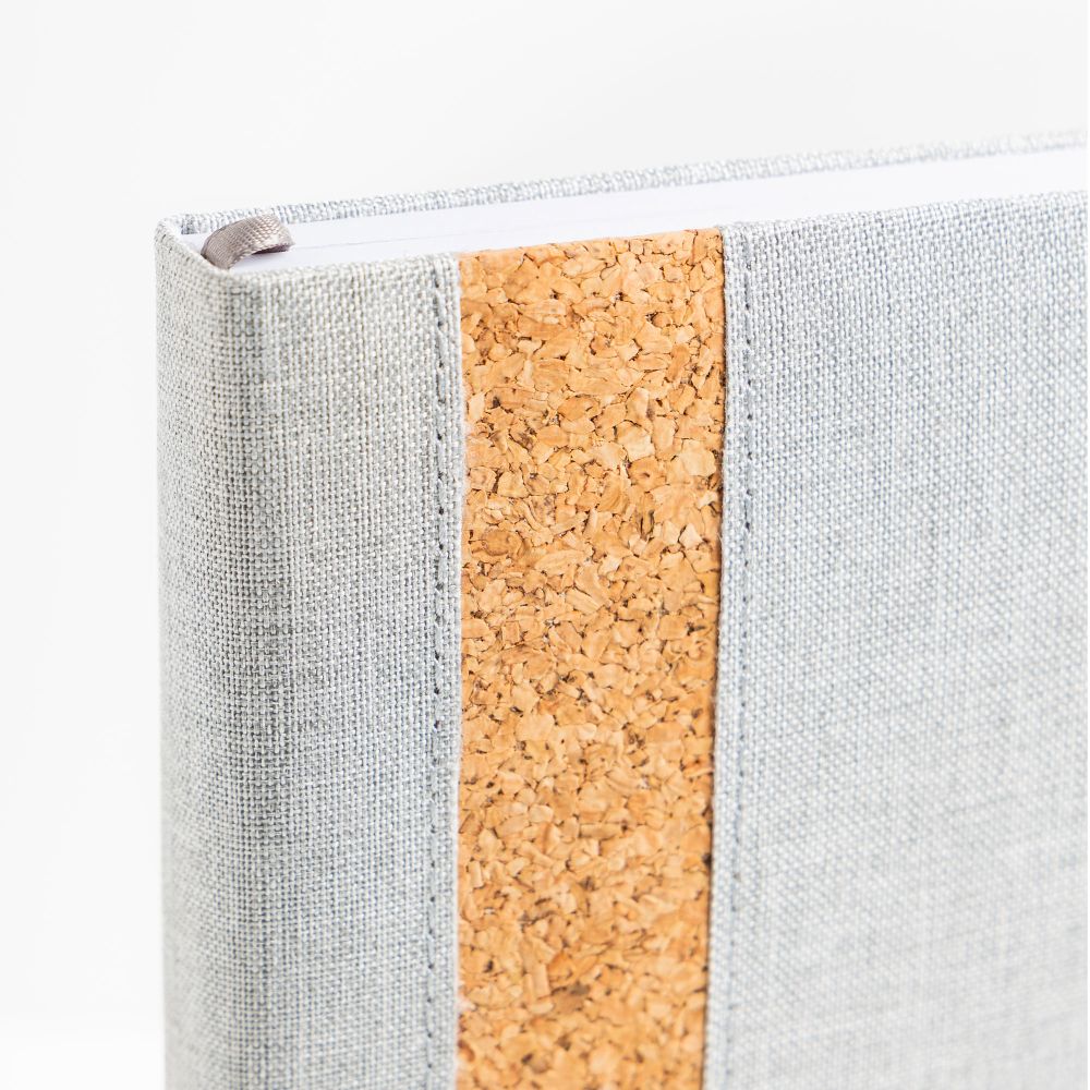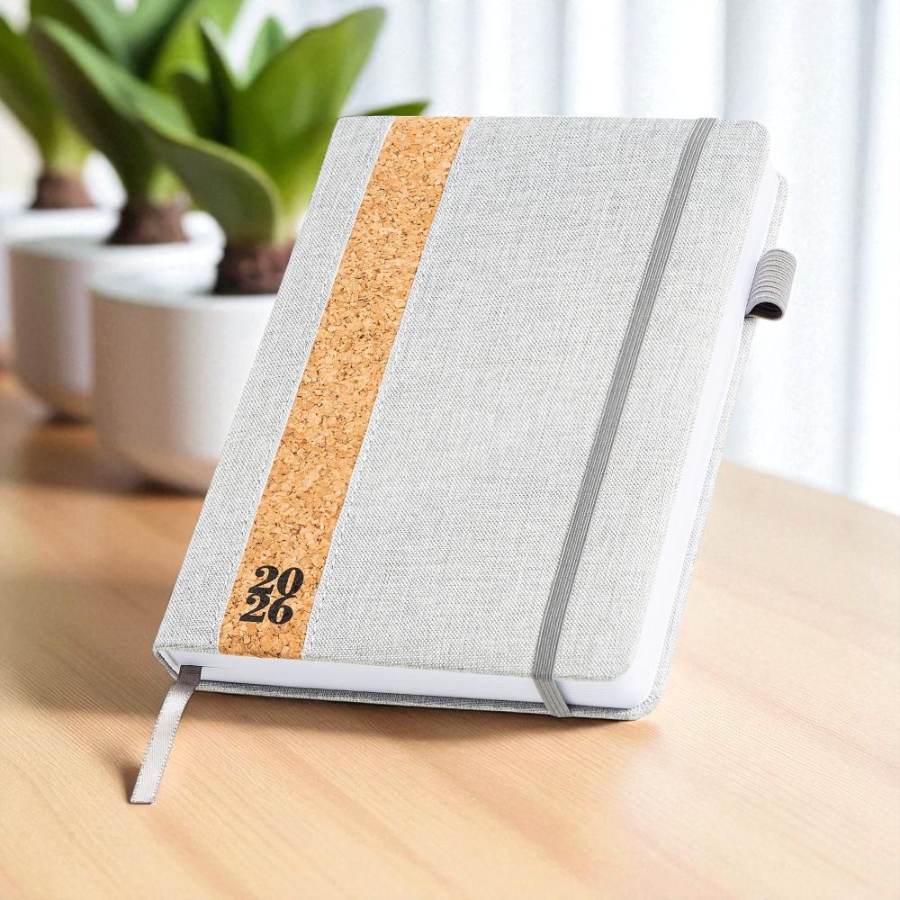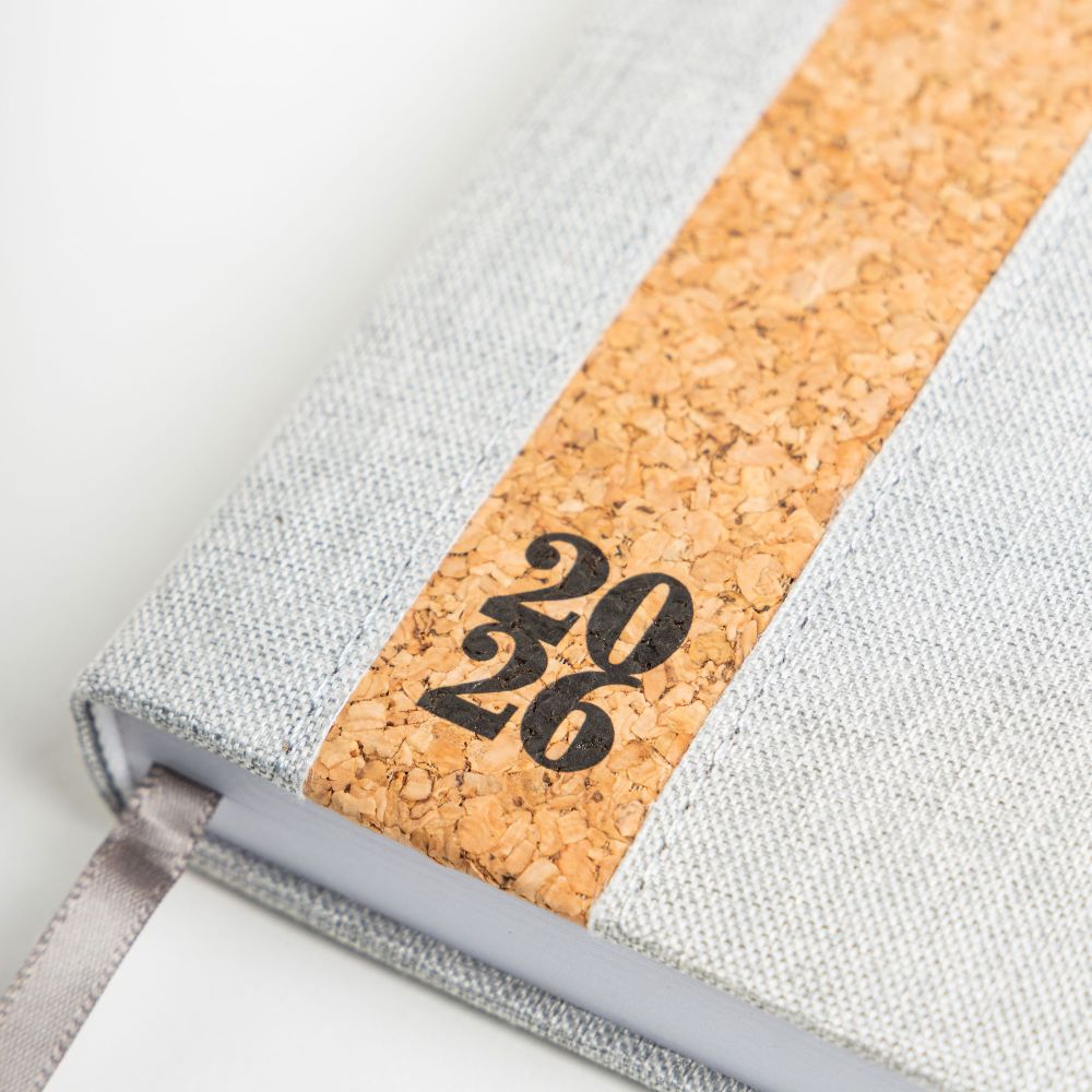 Agenda diária A5. Capa em linho e cortiça com fitilho , elástico de fecho e suporte para esferográfica. Com 336 páginas , em papel branco 70gr e certificação FSC (papel proveniente de florestas geridas de forma responsável). Idiomas principais: Português e Espanhol. No interior inclui: espaço para preenchimento de dados pessoais; calendário completo de 2026 e semestre de 2025 e 2027; feriados em lista; plano de férias; plano diário 2026 e espaço para preenchimento de contactos importantes (de A-Z).