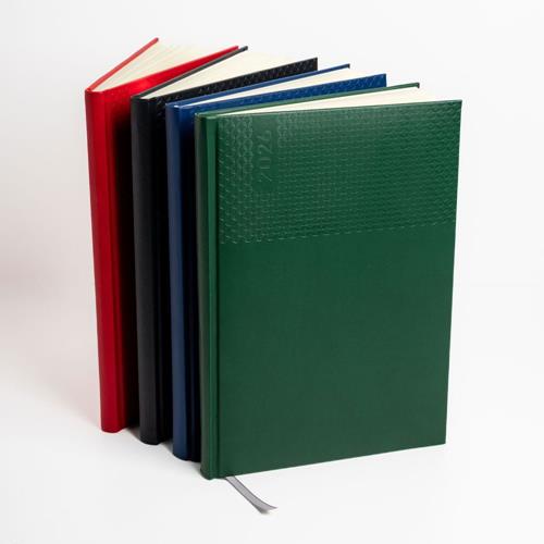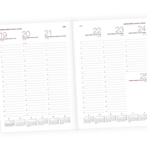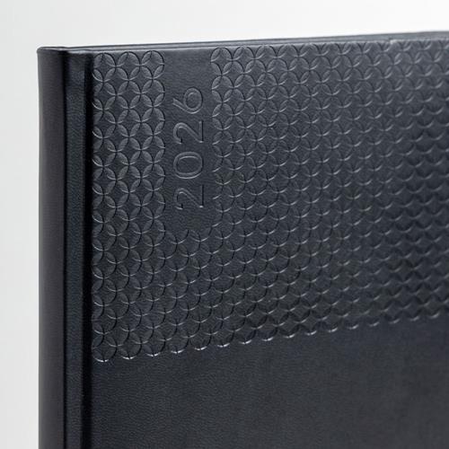 Agenda semanal A5+. Capa em PU e fitilho prateado. Possui 144 páginas, em papel marfim de 80gr e certificação FSC (papel proveniente de florestas geridas de forma responsável).Idioma principal: português e espanhol. No interior inclui: espaço para preenchimento de dados pessoais; calendário completo de 2026 e semestre de 2025 e 2027; lista de feriados e feriados internacionais; fusos horários no mapa; fatores de conversão; símbolos matemáticos; fatores de multiplicação; plano de férias; espaço para preenchimento de contatos (de A a Z) e 6 páginas em branco para notas.