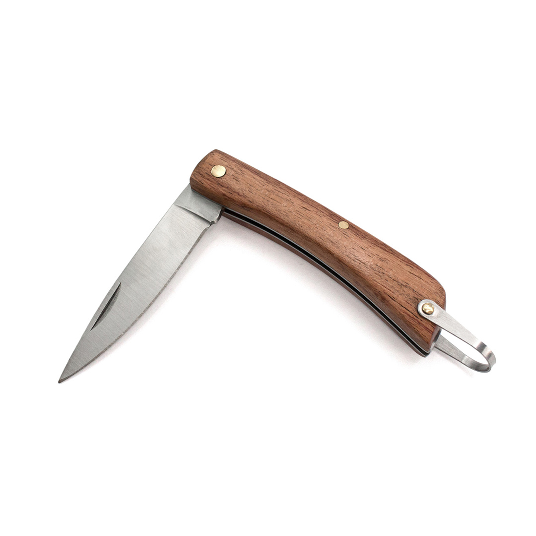 Canivete em aço inoxidável e pega em madeira natural com acessório de ajuste. Apresentado em uma caixa individual.