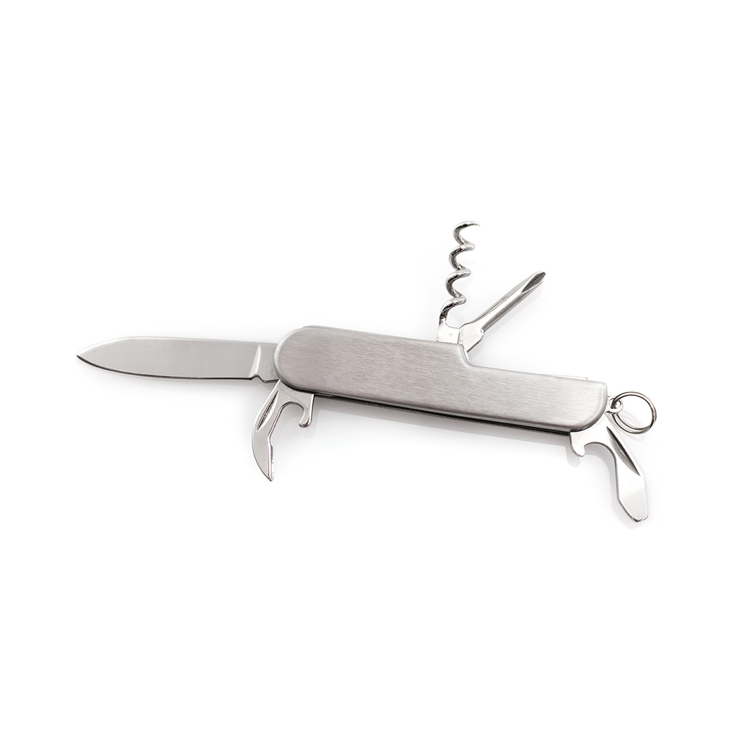Canivete multiusos em aço inoxidável com múltiplos fins de finalidade com 6 funções. Inclui faca, abridores, chave de fenda e chaveiro. Apresentado em uma caixa individual.