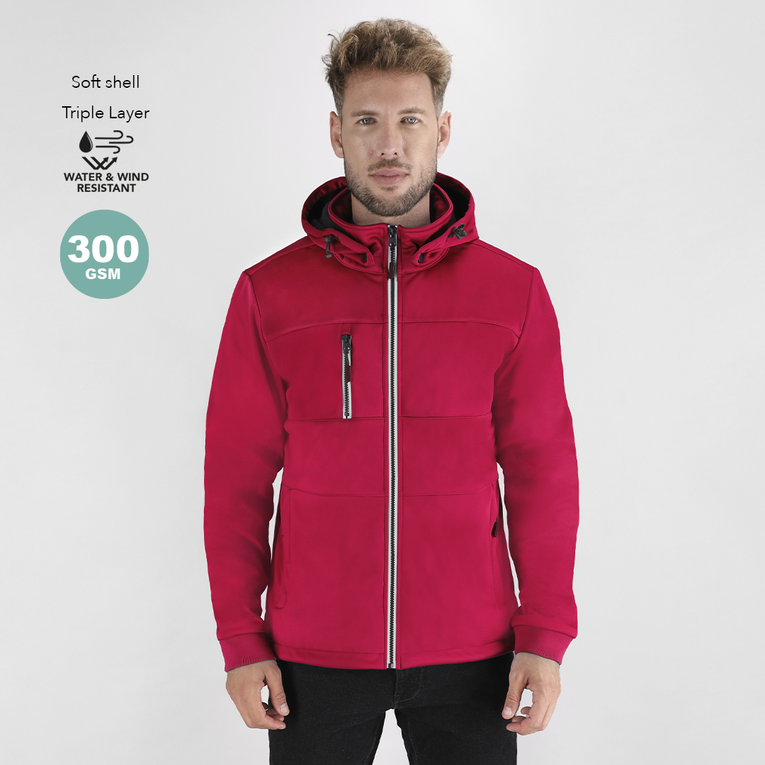 Casaco de resistente e transpirável material softshell de 300g/m2. De corte moderno, com fecho de correr central, bolsos laterais e prático bolso no peito com fechos de correr e puxadores em contraste. Gola alta com capuz ajustável e removível. Bainha inferior com cordão ajustável. Mangas com cómodos punhos de malha de cor a condizer. Exterior em softshell resistente ao vento e à água, e interior de quente micropolar em cor contraste.