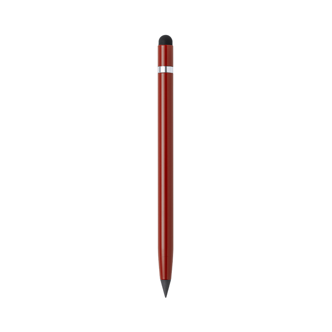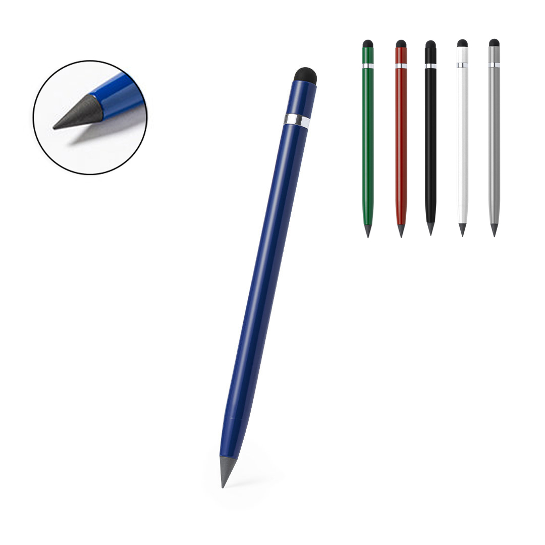 Lápis de ponta eterna, feita em alumínio com acabamento metalizado e com anel cromado. Reutilizável e com escrita infinita, para assim usar sempre o mesmo lápis e não gerar resíduos. Inclui borracha no interior do lápis.