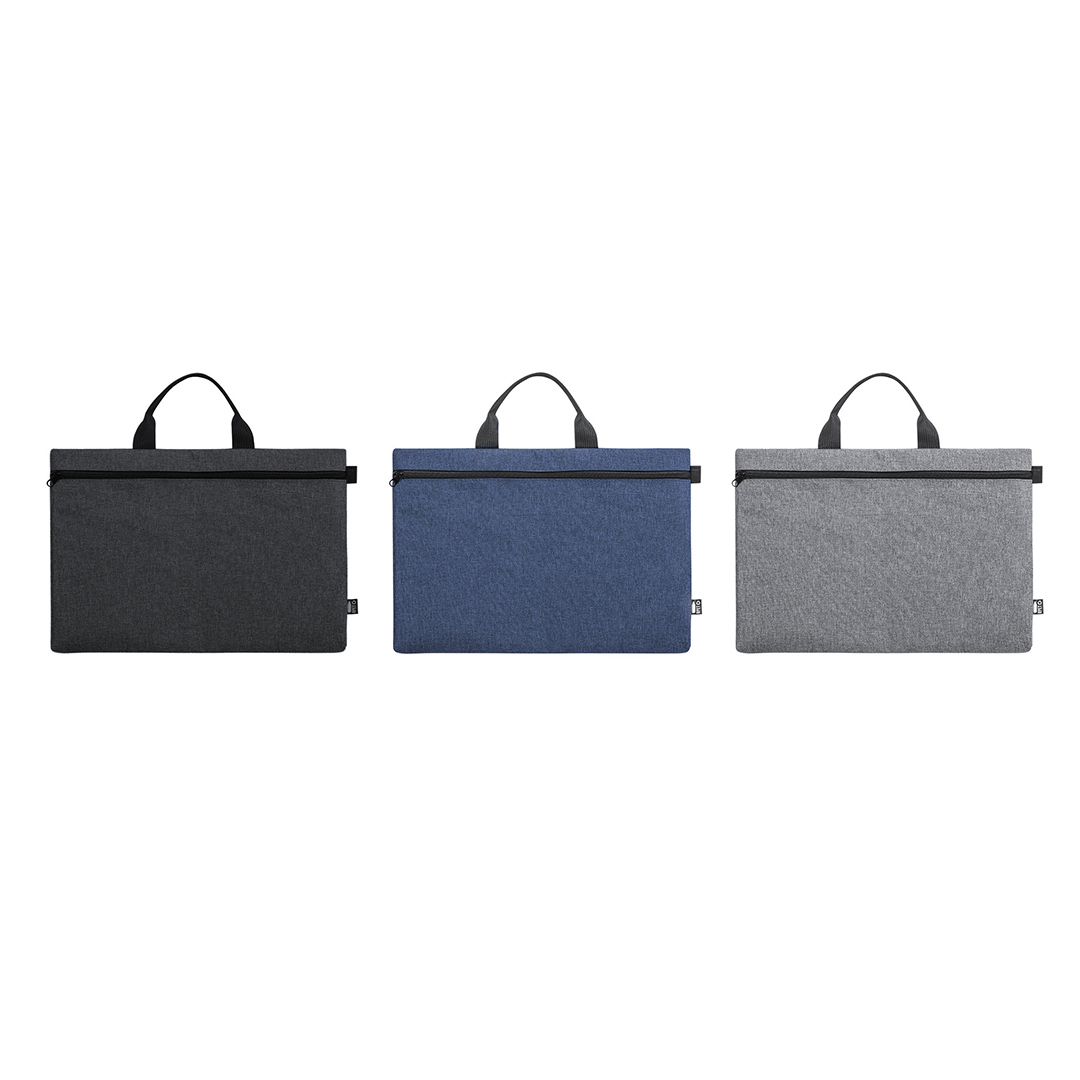 Porta-documentos em 600D RPET efeito melange, elaborado a partir de plástico reciclado para assim incentivar a reutilização de resíduos plásticos e contribuir para a sustentabilidade do planeta. Detalhes pretos e compartimento principal com fecho de correr. Alças resistentes a condizer e distintivo RPET na etiqueta exterior.