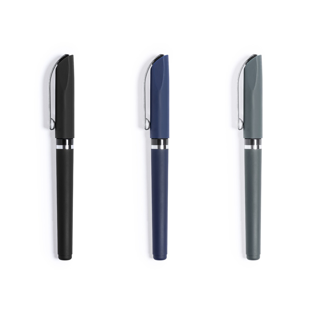 Roller fabricado em ABS e corpo com toque aborrachado. Clip metálico, acessórios em cromado. Carga jumbo e escrita azul.